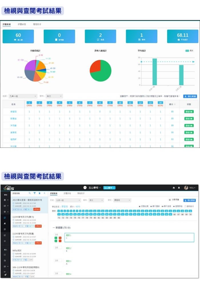 任課教師、學校教學管理團隊利用平臺即可檢視詳細的考試結果,例如每一位學生的分數、逐題作答結果、完整的原始答題卷、分數段統計圖等。