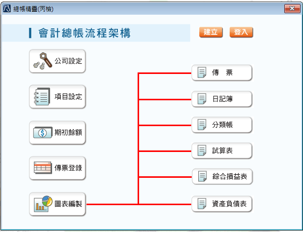 2.操作簡便:流程圖示呈現,圖形化的介面,循序完成會計總帳流程,簡化許多複雜的程序,讓各 種表單格式一致,使用者只要熟悉其中一種表單輸入方式,便可迅速適應各式表單操作。