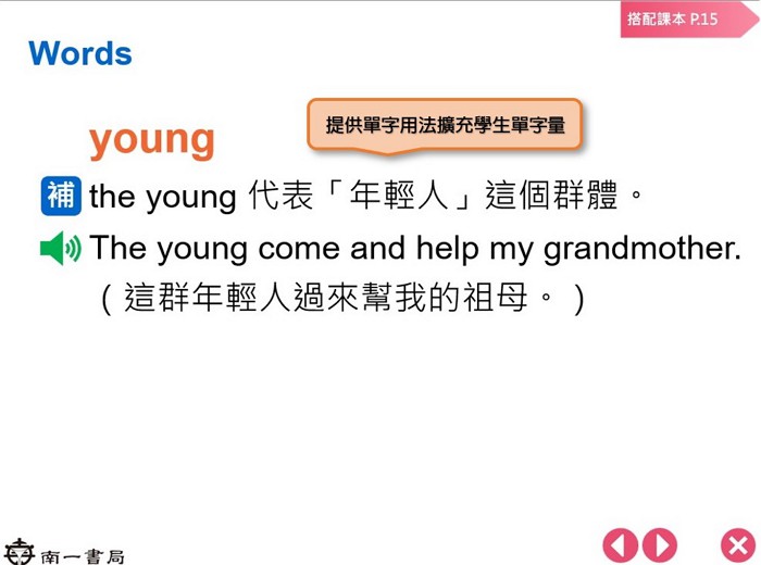 (5)每個單字皆附有{補充}說明單字用法與相關字詞,幫助學生完整學習.