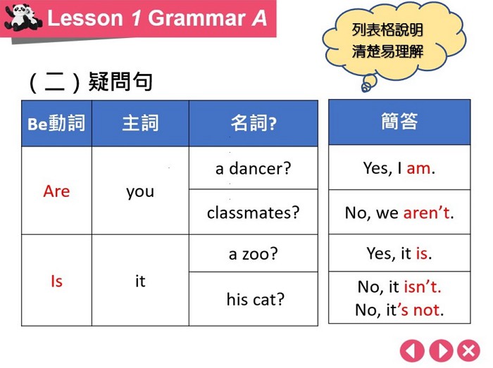 每個文法重點皆採用{表格式}的整理與編排,並有中文的說明(重點文法中文說明特別用紅色字標示),幫助學生清楚理解每個文法觀念與重點,及文法觀念的比較與用法.
