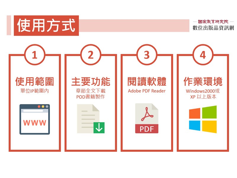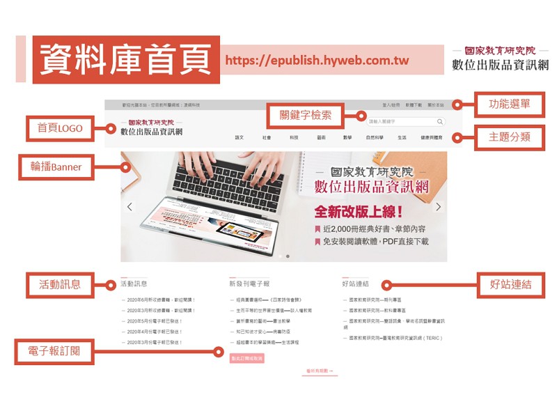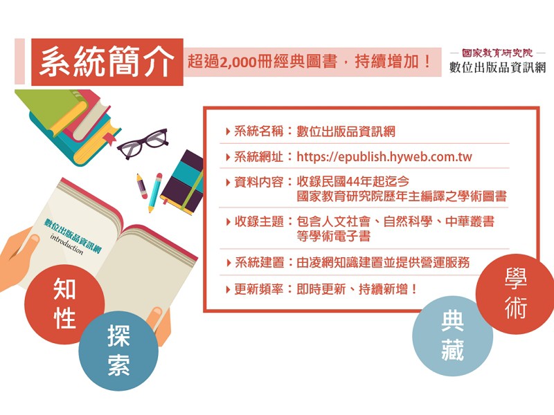 1.收錄國家教育研究院(原國立編譯館)超過2千冊歷年出版之各類主題電子書(含主編譯、學術絕版書、特色學科用書、參考書等各類出版品)。