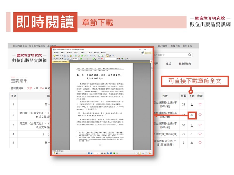 4.提供師生線上即時查詢電子書之「書目」、「簡介」、「篇章」、「出版資訊」等資料,24小時即時「章節下載」及「全書列印」(POD)等服務,服務對象包含「個人」及「團體」單位。