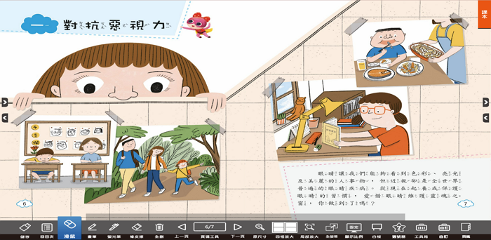 4.下方操作工具列(滑鼠、畫筆、螢光筆、橡皮擦、全刪、四格放大、局部放大、上下頁、便利貼、連結、插入文字、插入注釋、可撕貼紙...等),是學生配合學校教學進度進行數位學習不可或缺的工具。