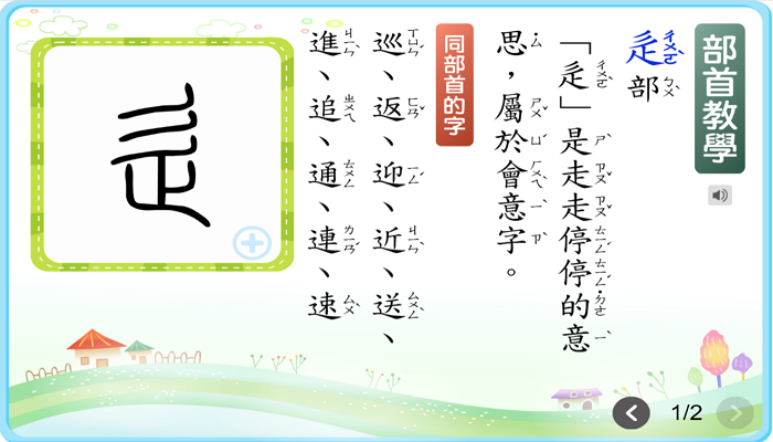 有了部首教學寶典,將部首教學化繁為簡,內含國小階段常用的生字部首,系統化整合,能迅速查找到所需的部首資訊。音檔說明每個部首的意思,一字一句說給你聽,文字、注音在一旁好清晰,同部首的生字有哪些,通通舉例報你知,未來遇到這些字,部首判別無難事,還有搭配部首本意或延伸意的說明圖幫助學生記憶,加上小篆到楷書的文字演變,「圖字一體」記憶加深再加深。透過圖文並茂的教學多媒體,學生快速理解部首意義,不再死背硬記,好神氣!