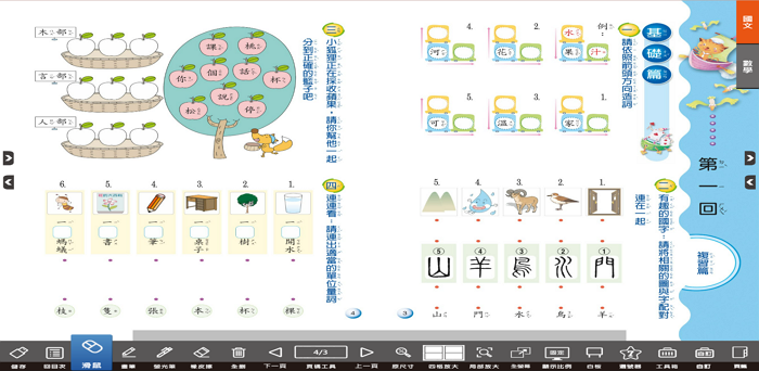 1.下方操作工具列(滑鼠、畫筆、螢光筆、橡皮擦、全刪、四格放大、局部放大、上下頁、便利貼、連結、插入文字、插入注釋、可撕貼紙…等),是學生配合學校教學進度進行數位學習不可或缺的工具。