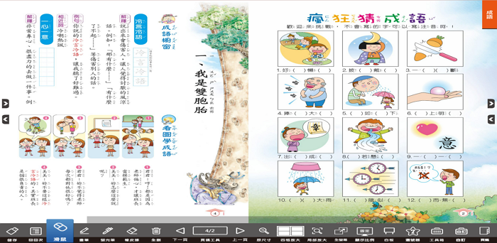 4.下方操作工具列(滑鼠、畫筆、螢光筆、橡皮擦、全刪、四格放大、局部放大、上下頁、便利貼、連結、插入文字、插入注釋、可撕貼紙...等),是學生配合學校教學進度進行數位學習不可或缺的工具。