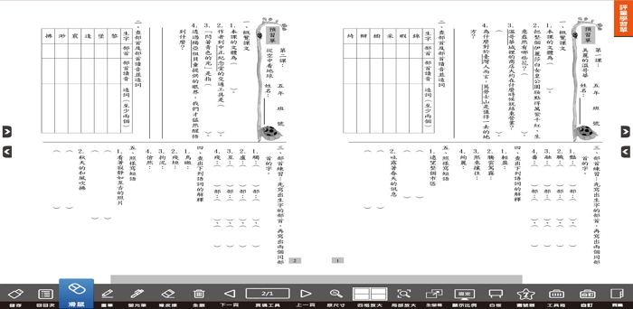 2.下方操作工具列(滑鼠、畫筆、螢光筆、橡皮擦、全刪、四格放大、局部放大、上下頁、便利貼、連結、插入文字、插入注釋、可撕貼紙、選號器、白板、碼表、計時器、時鐘…等),是學生配合學校教學進度進行數位學習不可或缺的工具。