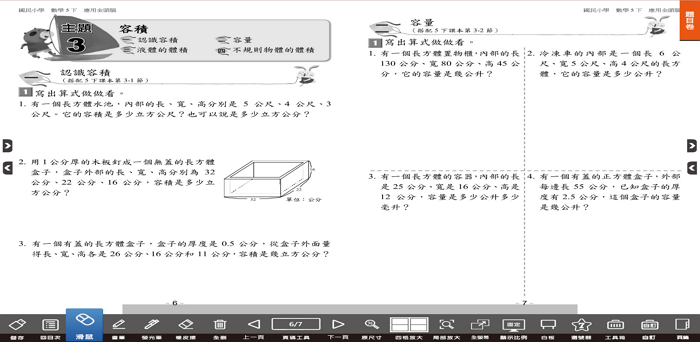 3.下方操作工具列(滑鼠、畫筆、螢光筆、橡皮擦、全刪、四格放大、局部放大、上下頁、便利貼、連結、插入文字、插入注釋、可撕貼紙、選號器、白板、碼表、計時器、時鐘...等),是學生配合學校教學進度進行數位學習不可或缺的工具。