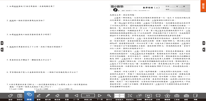 3.下方操作工具列(滑鼠、畫筆、螢光筆、橡皮擦、全刪、四格放大、局部放大、上下頁、便利貼、連結、插入文字、插入注釋、可撕貼紙、選號器、白板、碼表、計時器、時鐘...等),是學生配合學校教學進度進行數位學習不可或缺的工具。