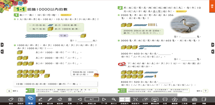 4.下方操作工具列(滑鼠、畫筆、螢光筆、橡皮擦、全刪、四格放大、局部放大、上下頁、便利貼、連結、插入文字、插入注釋、可撕貼紙...等),是學生配合學校教學進度進行數位學習不可或缺的工具。