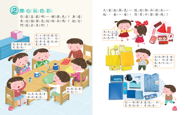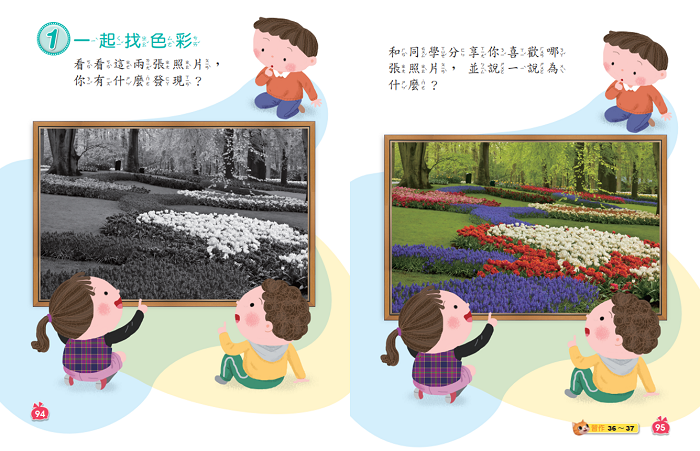 課本對應本單元以「色彩」為主題的知識點規劃教學影片,利用生活中所看得到的色彩,無論是在家中、學校又或是戶外,皆有多種不同的顏色,影片中引導學生發掘各個角落繽紛的顏色外,更利用小組競賽的方式抽色卡,以分工合作的方式來觀察生活中、校園中的物品顏色,並讓學生分享各個顏色帶來的感覺。以模擬情境演練的延伸方式做顏色的聯想,視覺、聽覺並用的方式體驗每個顏色帶來不同的涵義,運用課本中的知識解決生活中的問題,讓素養更生活化!