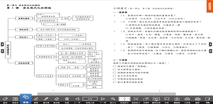 2.下方操作工具列(滑鼠、畫筆、螢光筆、橡皮擦、全刪、四格放大、局部放大、上下頁、便利貼、連結、插入文字、插入注釋、可撕貼紙、選號器、白板、碼表、計時器、時鐘...等),是學生配合學校教學進度進行數位學習不可或缺的工具。