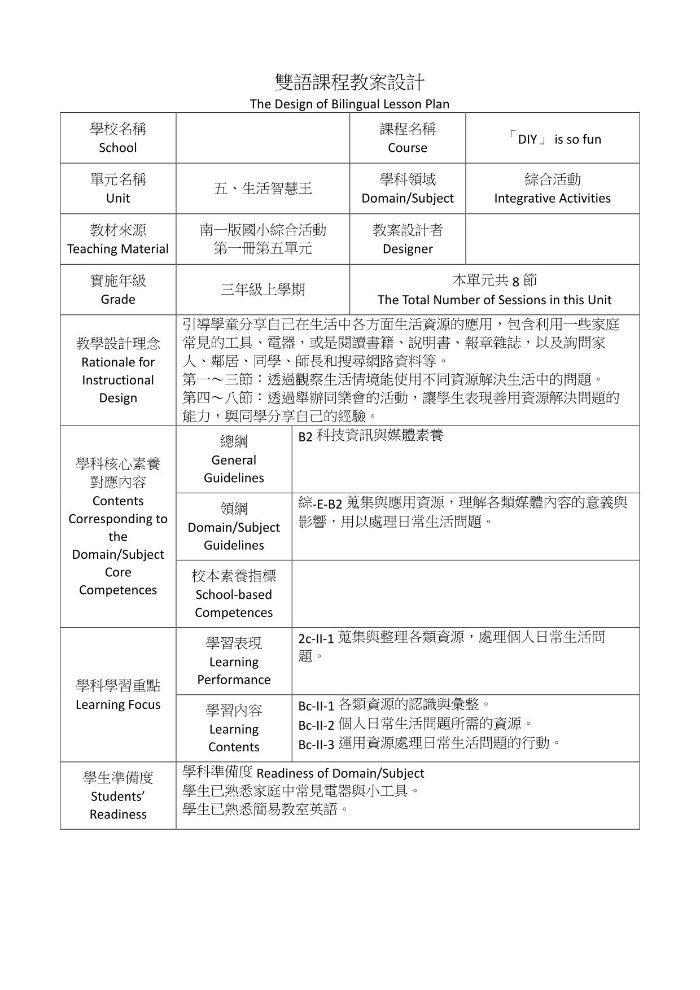 (3)雙語綜合活動主題式教案示例和學習單:依教育部雙語教案格式製作,方便老師觀課、備課使用。