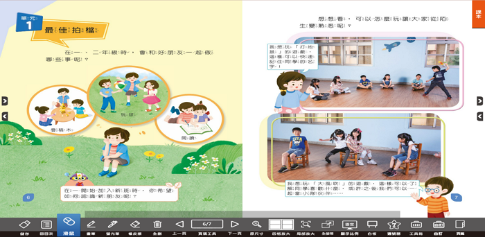 4.下方操作工具列(滑鼠、畫筆、螢光筆、橡皮擦、全刪、四格放大、局部放大、上下頁、便利貼、連結、插入文字、插入注釋、可撕貼紙...等),是學生配合學校教學進度進行數位學習不可或缺的工具。