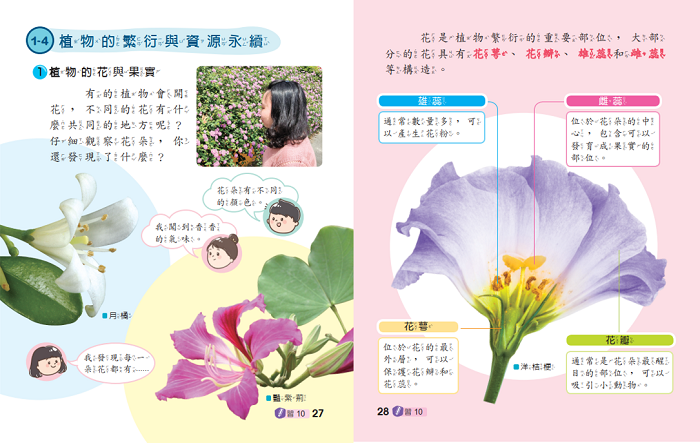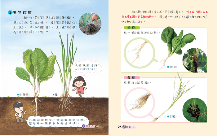 課本對應本單元以「植物」為主題的知識點規劃教學影片,利用生活中所看得到的植物去觀察,透過教學影片即可了解且分辨更多不同的植物為軸根還是鬚根進行生長,透過觀察可以了解到植物的根、莖、葉、花、果實、種子的實體構造,並且透過影片深入了解植物的生長方式和繁衍過程的知識。亦可實際利用視覺、觸覺、嗅覺,從觀察植物到了解植物的根、莖、葉,到植物的繁衍方式與資源的永續,以記錄表的方式將結果記錄下來,並且和同學分享。
