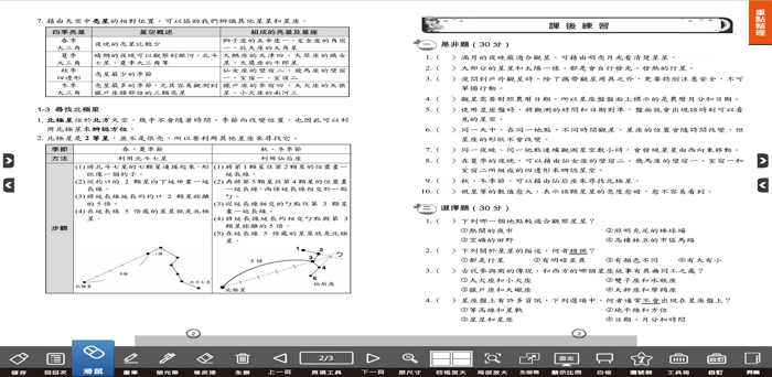 2.下方操作工具列(滑鼠、畫筆、螢光筆、橡皮擦、全刪、四格放大、局部放大、上下頁、便利貼、連結、插入文字、插入注釋、可撕貼紙...等),是學生配合學校教學進度進行數位學習不可或缺的工具。