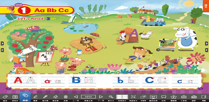 4.下方操作工具列(滑鼠、畫筆、螢光筆、橡皮擦、全刪、四格放大、局部放大、上下頁、便利貼、連結、插入文字、插入注釋、可撕貼紙...等),是學生配合學校教學進度進行數位學習不可或缺的工具。
