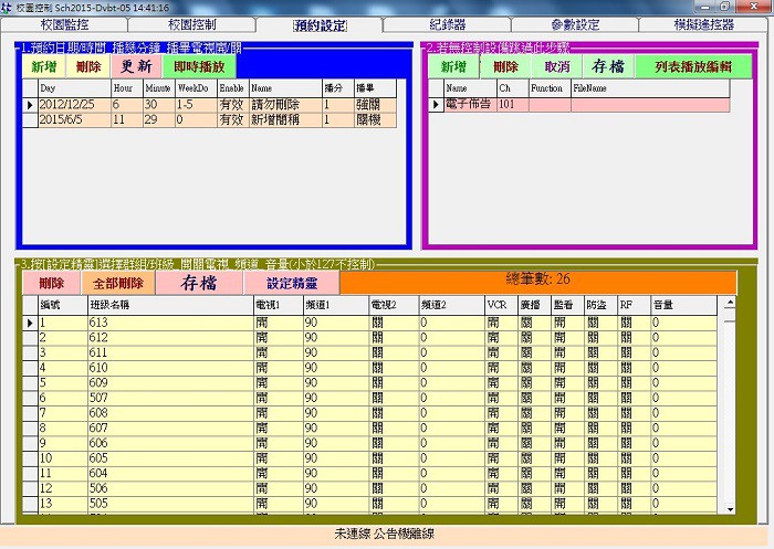 10.具有節目編輯功能:學校可事先排定教學課程,時間一到系統自動開啟液晶顯示器播放教學內容,完畢自動關機。