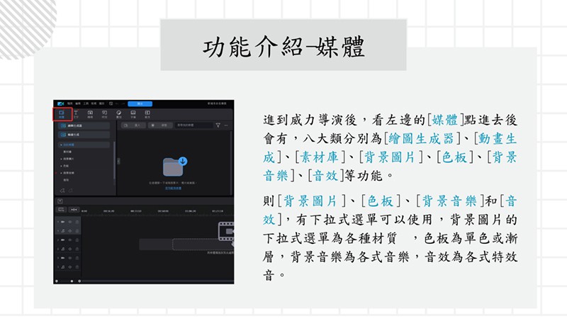 內建豐富的素材庫,包括音樂、圖像和影片。