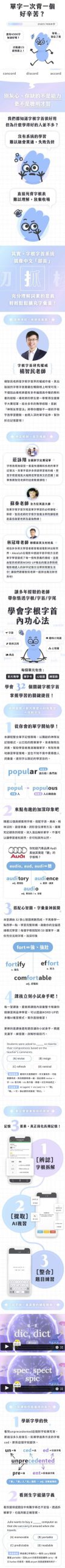 課程中提供生動有趣的動畫課程,結合有趣的故事讓學生學習時處處有驚喜,更結合專業外籍教師配音,讓學生可以透過 1200 張數位單字卡學會正確的單字發音!此外楊老師更提供超過 300 題練習題,讓學生從”學習”到”練習”加強英文實力,教材中更有精美的心智圖講義可以加深學生的記憶。單字的學習從字根字首開始,與單字之間距離就此弭平!
