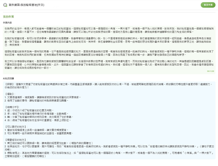 學習吧AI寫作批改小幫手針對國小生提供分級回饋,根據年齡與寫作能力調整批改難度。針對小日記、讀書心得及短篇作文,AI給出簡單明確的建議,以鼓勵為主,幫助學生在寫作中逐步增強自信。