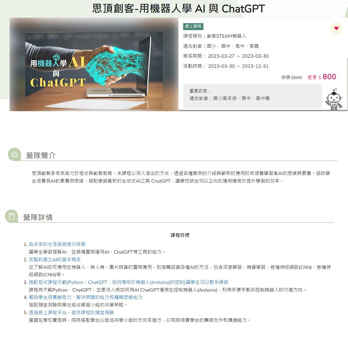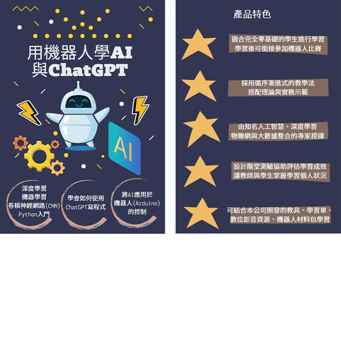 2. 由知名人工智慧、深度學習、物聯網與大數據整合的專家-淡江大學資工系特聘教授、同時也是淡江大學工學院物聯網與大數據研究中心的主任張志勇老師主要授課,再搭配業界資深老師進行示範。課程深入淺出,對學生建立完整AI基本概念幫助很大由名師教授學習最新的AI ChatGPT等工具,即早培養與奠定學生AI的邏輯思維。