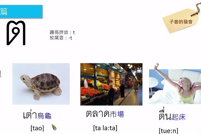 泰語發音的部分,以中文、英文的音輔助模擬出最接近泰語的字母發音,講解如何記下每一個音。基本會話的部分,則能學會打招呼、問候等最基礎也最重要的表達,在熟稔這些表達後,便會進入正課。配合前面紮根的兩項基礎,便可在泰語道地的語調中、學習到生活必需的泰語會話,以及泰語文法。