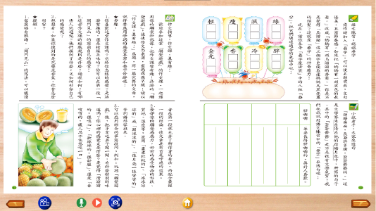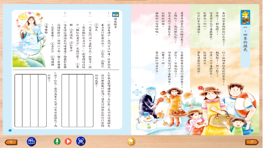 4.美麗的版面:低年級教材為繪本風格,中高年級教材則圖文並重,有意境的彩色圖片引領學習興趣與創意想像。還加入生動活潑的兒歌,讓小朋友跟著唸,課後都有字詞填空測驗,訓練同學作文的邏輯概念,引發創意思考。