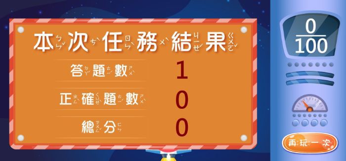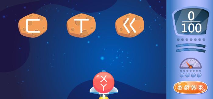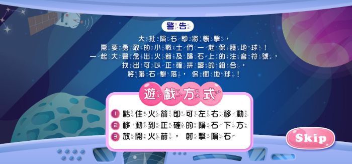 1.使用說明:以趣味的「保護地球、射擊隕石」遊戲方式讓學生演練注音拼讀組合,只要移動火箭到正確的注音隕石下方就可以成功擊落隕石,讓學生在趣味中重複練習,進而熟練各種拼讀組合。