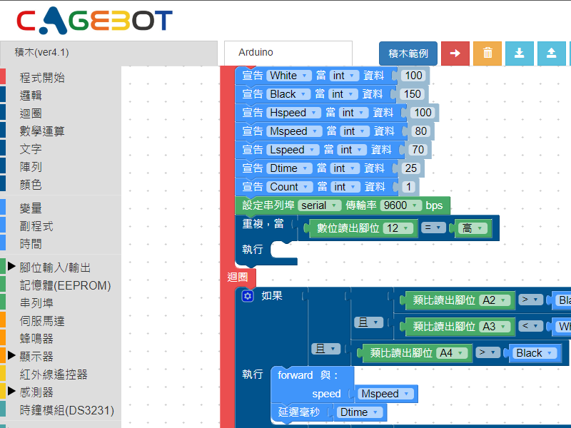 Cagebot_blockly程式,可用於練習Arduino程式設計的語法與技巧。Cagebot_blockly的程式功能非常多
