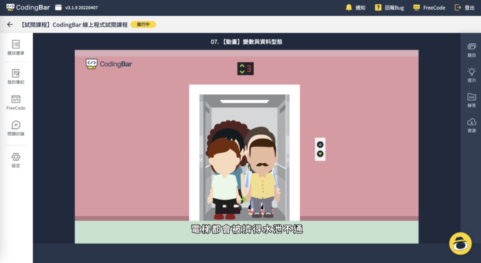我們透過專心特製的動畫影片,講解說明複雜的程式觀念,讓零基礎的初學者輕鬆入門,同時配合 CodingBar 智慧程式學習平臺,在每一個知識點學習完之後,立刻做練習檢測學習成效,平臺並可以立刻檢閱程式碼,提供錯誤的修正建議,培養學生自主學習的能力。