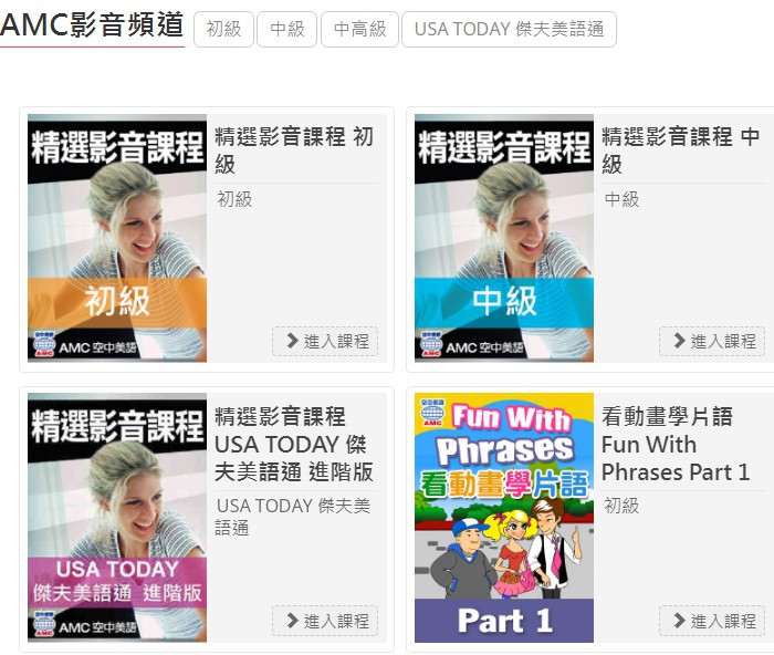AMC影音頻道提供多種系列教材,包括空中美語雜誌影音、基礎課程和傑夫美語通實用版等。