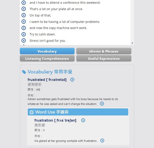 * 中西文化多元題材的影音會話課程,搭配講師解析片語單字文法點。