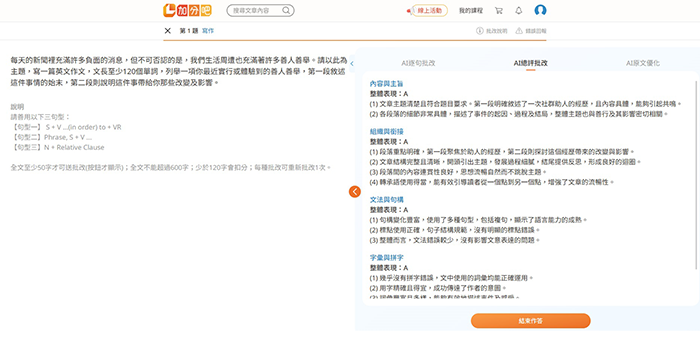 3. AI提供作文逐句批改,並依照學測評分規則進行總評和提供回饋,最後再提供原文優化,讓你具體找出問題,突破寫作困境。
