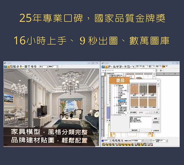 8. 不須外掛渲染程式,即時彩現(色彩、建材、光影、3D效果立即呈現),算圖、出圖快速省時。