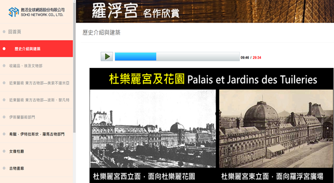 這幾個面向,進行詳細的導覽解說。首先會帶領閱聽者認識羅浮宮建築的演進及命名起源;接著依照現今羅浮宮分館、羅浮宮博物館入口、羅浮宮地圖、展覽區域等,分別做外觀及內部的說明。而收藏品的部分則會依照館內「古物部」地理位置的劃分,針對各種豐富多元的雕塑品、兵器、陶器、石碑、繪畫……窺探古人蓬勃發展的工藝技術及重現當時社會階層與地方文明。