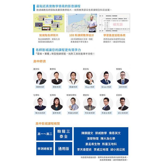 含 高中 全科必修、選修適版、學測總複習 教學影片暨班級追蹤管理