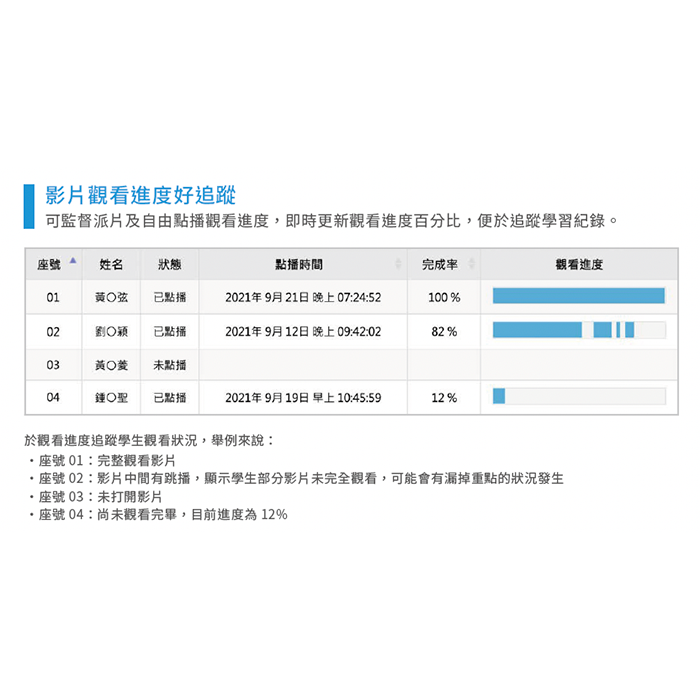 6. 搭配功能:老師專屬追蹤影片播放進度頁面、同步完成率觀看、全班或個人觀看紀錄追蹤。