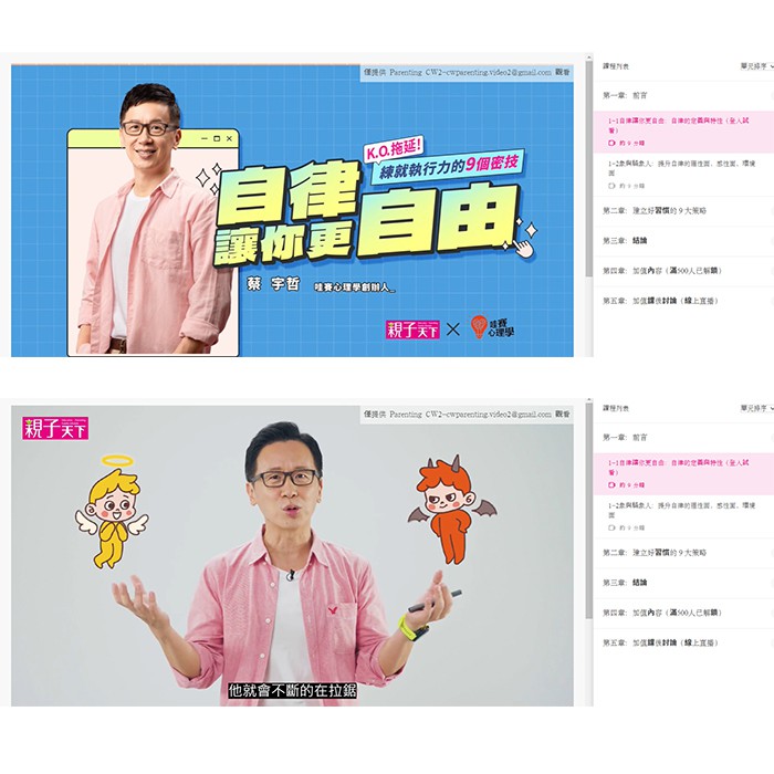 心理學博士、哇賽心理學創辦人蔡宇哲老師,提供3大面向×9大策略,結合有科學基礎的心理學知識、簡單容易執行的具體做法,帶領你將課程所學轉換成行動計畫,讓你克服當下衝動、戒掉拖拉,拿回生活主控權,享受自由人生!