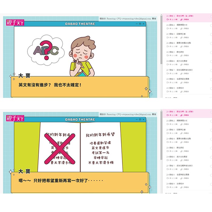 透過動畫人物「大寶」與「阿財」的簡短演出,把你或你身邊重要他人的自律難題帶出場。