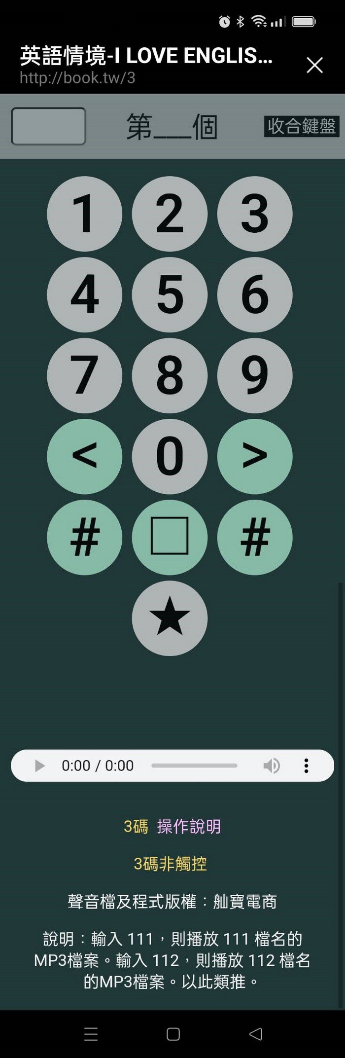 ◆英語情境 – I LOVE ENGLISH,需運行在支持MP3聲音播放的設備上。硬體需求:需手機、平板電腦或電腦,能夠連接網路上網。軟體需求:適用於多種作業系統,例如:Windows、Mac OS、IOS、Android 等,需要有網頁瀏覽器而且可上網。