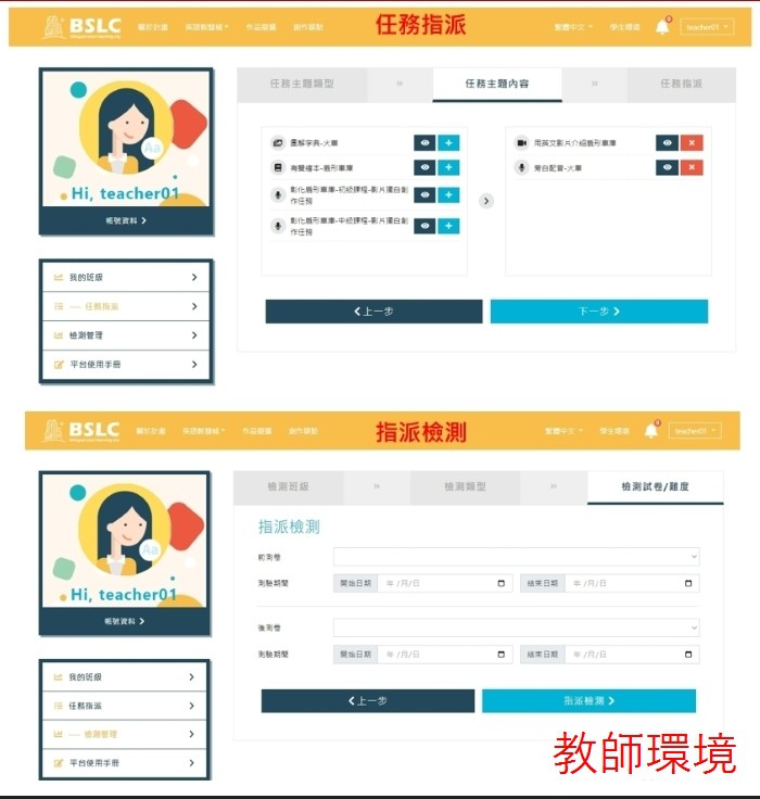 1. 平臺提供對應主題的檢測題目,提供教師指派前測、後測及學習目標給學生做檢測,教師可於指派任務前,進行前測,並於任務期間讓學生進行學習,完成任務與學習後,進行後測。
