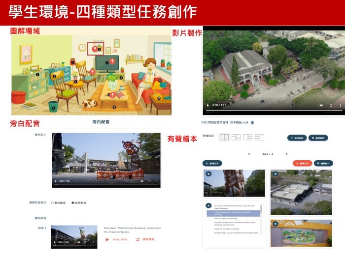 提供師生可以於平臺創作任務與作品共享,學校師生可以透過open ID方式進行登入。平臺將分為教師及學生身分,教師可以從主題任務題庫中,指派任務給班級學生來做創作,創作類型分為有聲繪本、圖解場域、影片製作及英語配音,學生創作完成後,經由老師批改通過後,將可取得認證。