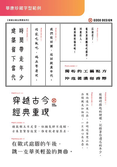 收錄華康經典中文字型,從經典的圓、黑、楷、明體基礎字型,古風雋永的書法體,再到個性十足的手書風、美工POP等多種設計書體,用多樣的字型表情,撐起每次設計的最大創造力!