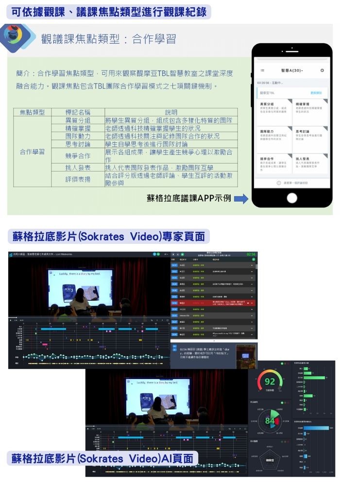 「蘇格拉底AI套件」提供更高效的影片處理技術,結合以HiTeach智慧教學系統所建構的智慧教室,引入AI數據分析技術與觀議課專家觀課紀錄整合的機制,將課堂教學過程的影音,與觀議課紀錄表自動化整合。觀議課專家或教師團隊在觀課時,使用蘇格拉底議課app進行標記、拍照、錄影、錄音、文字記錄等工作,課堂結束後,自動匯集所有觀課者記錄的數據,提供觀議課活動最有效的工具。