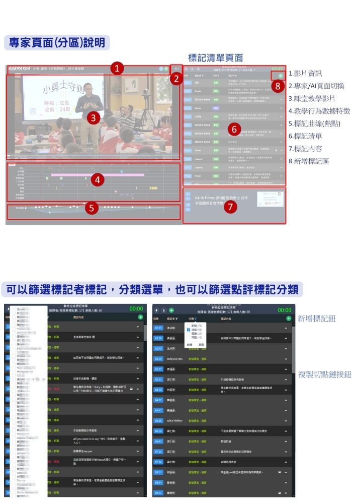 蘇格拉底影片中的數據相互連動,包括課堂教學影片、教學行為數據特徵、標記曲線(熱點)、專家標記清單、標記內容等五項數據的時間軸相互連動。例如點選數據特徵時,會自動切換到相應的影片位置、標記位置、顯示標記內容。