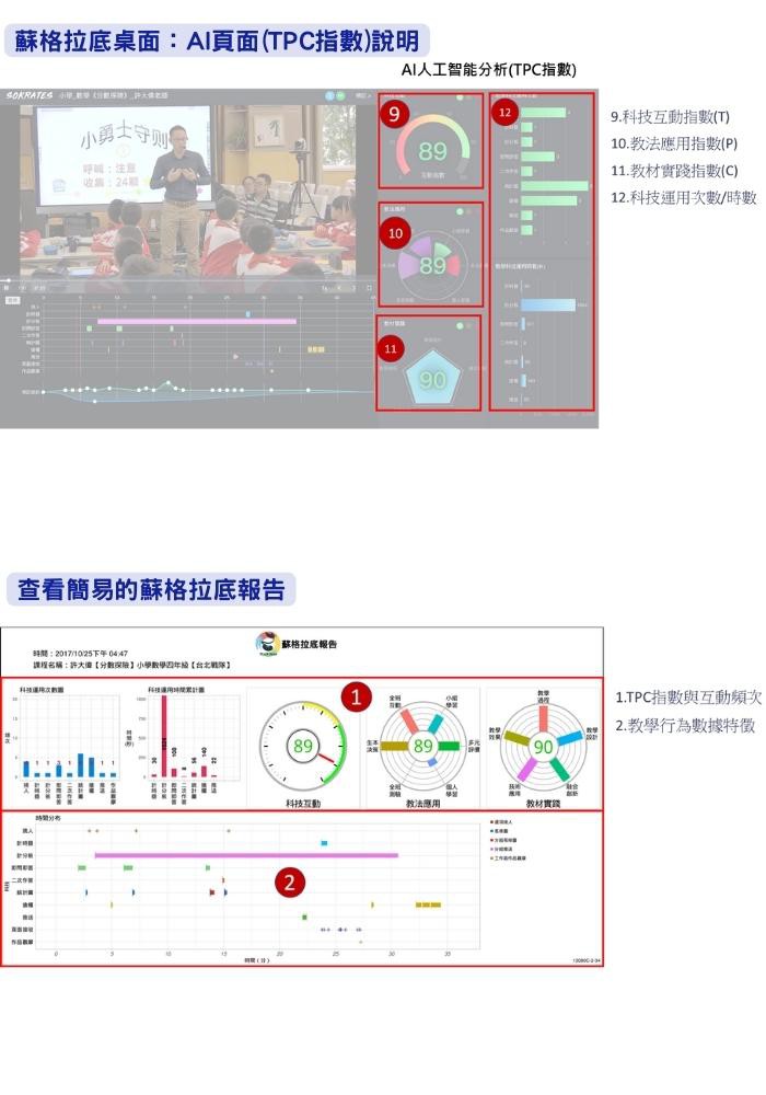 除了蘇格拉底桌面之外,根據教學行為數據特徵分析,也會立即產出數據報告-蘇格拉底報告。這樣,用一分鐘來解讀蘇格拉底報告,就可以快速品味40分鐘的完整課堂。蘇格拉底報告內容,是由TPC指數與互動頻次和教學行為數據特徵等兩個部分所組成。