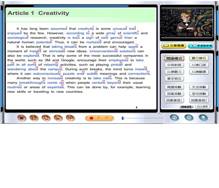 3. 「學習模組」包括:「游標隨顯幫助」、「即時錄音」、「即時中譯幫助」、「聽力模式」、「中英對照模式」、「複習式字典」等,幫助快速完成內容的基本學習。