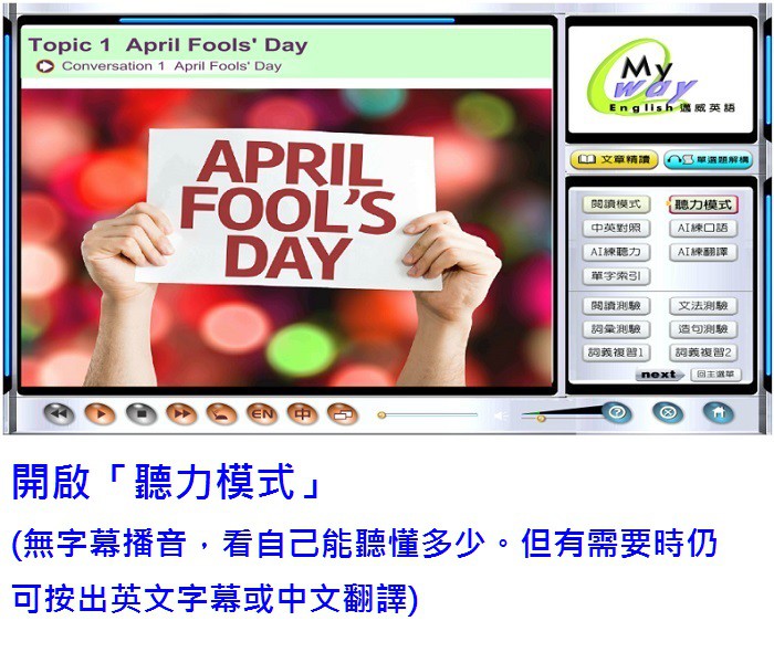 6. 本產品有三個階段模式 ─ 學習模式 > 練習模式 > 測驗模式。各個階段模式都經過精心設計,並都有強大的功能幫助您用多元感官快速練習,甚至動用到最先進的AI語音辨識技術,助您深耕英文實力,登上頂峰。