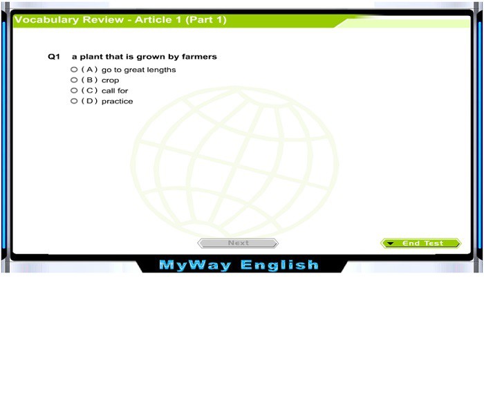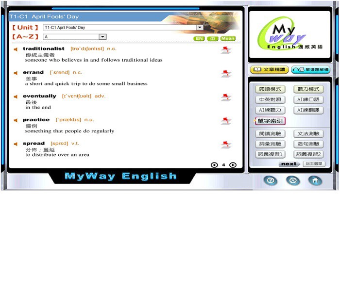 5. 「測驗模組」功能:在作完學測每一單元的試題後可立即核對答案,並提供詳解,有效進一步消除學習死角。同時大幅增加文法練習與句子中翻英練習的題數,以強化寫作能力。此外,再增加英英詞彙複習測驗,以加強英英模式學英文的效果。